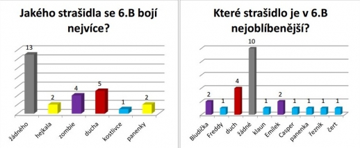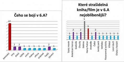 | Počet článků: 36 Anketa o strašidlech a fobiíchRubrika: Ankety Adéla Koutská 10.11.2015 Jelikož jsme podzim zasvětili tématu "Strach má velké oči", tak jsem si pro žáky druhého stupně + pro páťáky připravila anketu o strašidlech. Některé třídy anketu vyplnily pečlivě a jiné ji jen odflákly. No, ostatně se na výsledky ankety můžete podívat sami. Anketa - Strašidla a fobie Anketa - Strašidla a fobie Anketa - Strašidla a fobie Anketa - Strašidla a fobie Anketa - Strašidla a fobie Anketa - Strašidla a fobie Anketa - Strašidla a fobie Anketa - Strašidla a fobie Anketa - Strašidla a fobie Anketa - Strašidla a fobie Anketa - Strašidla a fobie Anketa - Strašidla a fobie Anketa - Strašidla a fobie Anketa - Strašidla a fobie Anketa - Strašidla a fobie Anketa - Strašidla a fobie Myslím, že asi bylo jasné, že se žáci nejvíce bojí pavouků, ale to co mě zaskočilo, bylo, že pro někoho je film O statečném kováři, nebo film Čert a Káča strašidelný. Každý z nás je jiný a bojí se jiných věcí... Nebo nemá strach z ničeho. :-) Strašidla a fobie; nakreslila Kristýna Křupková Počet zobrazeni celkem: 6067 Počet zobrazeni za poslední měsíc: 70 | Doporučujeme Nejčtenější články (za poslední měsíc) Redakce